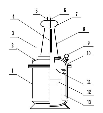 1-外殼 2-低壓儀表端子 3-套管法蘭 4-高壓硅堆 5-短路桿D 6-高壓輸出A 7-均壓球 8-高壓套管 9-閥門及壓力表 10-封頭 11-低壓繞組 12-高壓繞組 13-鐵芯夾件 |