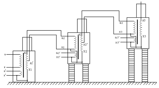 圖4:交直流氣體式試驗變壓器接線 圖中:D – 短路桿 VD – 高壓硅堆 4. 串級氣體式試驗變壓器接線及原理:如圖5 串級氣體式試驗變壓器有很大的優(yōu)越性,三臺試驗變壓器串級連接可獲得更高的電壓,因為整個試驗裝置由幾臺單臺試驗變壓器組成,單臺試驗變壓器容量小、電壓低、重量輕,便于運輸和安裝。它既然可串接成高出幾倍的單臺試驗變壓器輸出電壓組合使用,又可分開成幾套單臺試驗變壓器單獨使用。整套裝置投資小,經(jīng)濟實惠。圖5中,在第一級和第二級的每個單元試驗變壓器中都有一個勵磁繞組A1、C1和A2、C2。在串級試驗變器基本原理圖中,低壓電源加在試驗變壓器I的初級繞組a1x1上,單臺試驗變壓Ⅰ、Ⅱ、Ⅲ的輸出電壓都是V。勵磁繞組A1、C1給第二級試驗變壓器Ⅱ的初級繞組供電;第二級試驗變壓器Ⅱ的勵磁繞組A2、C2給第三級試驗變壓器Ⅲ的初級繞組供電。第二級試驗變壓器Ⅱ和第三級試驗變壓器Ⅲ的箱體分別處在對地為1V和2V的高電位上,所以箱體對地是絕緣的,試驗變壓器I的箱體是接地的。這樣第一級、第二級、第三試驗變壓器對地的額定輸出電壓分別為1V、2V、3V;其額定容量分別為3P、2P、1P。