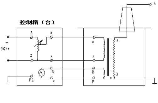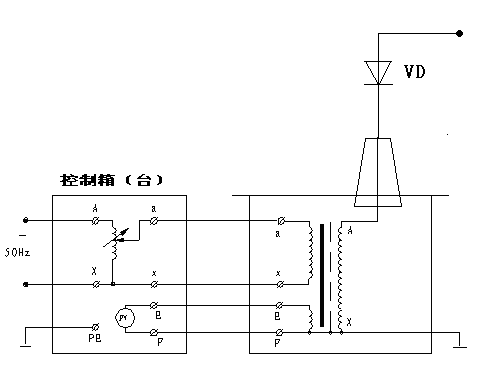 圖3:交流干式試驗變壓器接線 2. 交直流干式試驗變壓器:如圖4 圖中高壓輸出的上端裝有高壓硅堆,串接在高壓回路中作半波整流,以獲得直流高電壓。當取下不接高壓硅堆時,作為直流輸出狀態。