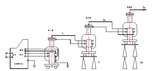圖4:交直流干式試驗變壓器接線 圖中:VD為高壓硅堆 3. 串級干式試驗變壓器接線及原理:如圖5 串級干式試驗變壓器有很大的優越性,三臺試驗變壓器串級連接可獲得更高的電壓,因為整個試驗裝置由幾臺單臺試驗變壓器組成,單臺試驗變壓器容量小、電壓低、重量輕,便于運輸和安裝。它既然可串接成高出幾倍的單臺試驗變壓器輸出電壓組合使用,又可分開成幾套單臺試驗變壓器單獨使用。整套裝置投資小,經濟實惠。圖5中,在第一級和第二級的每個單元試驗變壓器中都有一個勵磁繞組A1、C1和A2、C2。在串級試驗變器基本原理圖中,低壓電源加在試驗變壓器I的初級繞組a1x1上,單臺試驗變壓Ⅰ、Ⅱ、Ⅲ的輸出電壓都是V。勵磁繞組A1、C1給第二級試驗變壓器Ⅱ的初級繞組供電;第二級試驗變壓器Ⅱ的勵磁繞組A2、C2給第三級試驗變壓器Ⅲ的初級繞組供電。第二級試驗變壓器Ⅱ和第三級試驗變壓器Ⅲ的箱體分別處在對地為1V和2V的高電位上,所以箱體對地是絕緣的,試驗變壓器I的箱體是接地的。這樣第一級、第二級、第三試驗變壓器對地的額定輸出電壓分別為1V、2V、3V;其額定容量分別為3P、2P、1P。