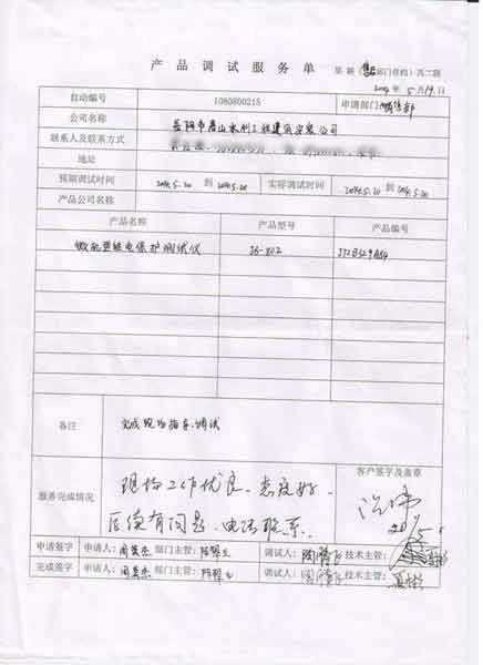 2014-05-20 岳陽市君山水利工程建筑安裝公司進行調試服務,調試產(chǎn)品:CYJB-802 微機型繼電保護測試儀
