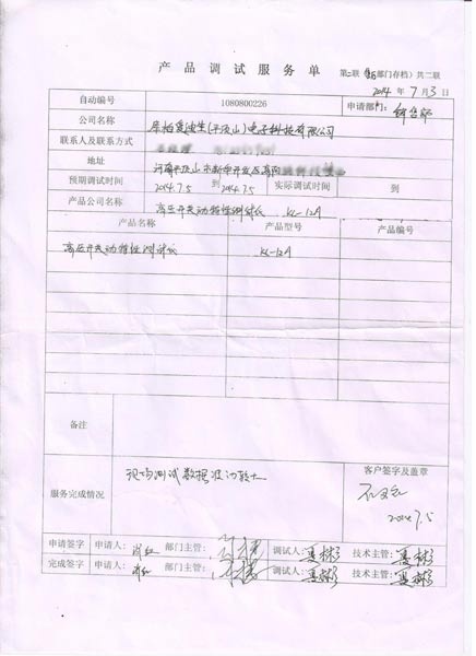 2014-07-03 河南庫柏愛迪生(平頂山)電子科技有限公司進行調試服務,調試產品:CYKC-12A高壓開關動特性測試儀