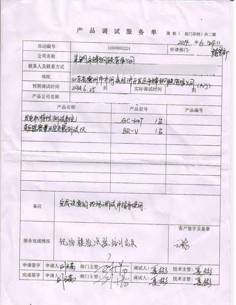 2014-10-30 山東萊鋼永鋒鋼鐵有限公司 進(jìn)行調(diào)試服務(wù),調(diào)試產(chǎn)品:CYBR-V變壓器容量及空負(fù)載測試儀 CYGC-600T發(fā)電機特性測試系統(tǒng)