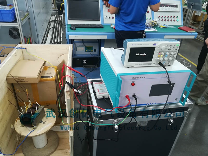 調試當天,我司技術人員將設備安裝好之后,按客戶要求準備做變壓器沖擊電壓試驗。現場在客戶的組織下首先開始培訓設備接線方法,從設備接地接線方法到最后連接被試品一個步驟不落的教授給客戶。接著進入實際操作演示。