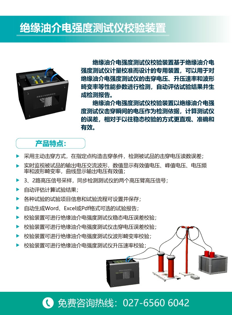 絕緣油介電強度測試儀校驗裝置基于絕緣油介電強度測試儀計量校準而設計的專用裝置,可以用于對絕緣油介電強度測試儀的擊穿電壓、升壓速率和波形畸變率等性能參數進行檢測,自動評估試驗結果并生成檢測報告,絕緣油介電強度測試儀校驗裝置以絕緣油介電強度測試儀擊穿瞬間的電壓作為檢測依據,計算測試儀的誤差,相對于以往穩態校驗的方式更直觀、準確和有效。