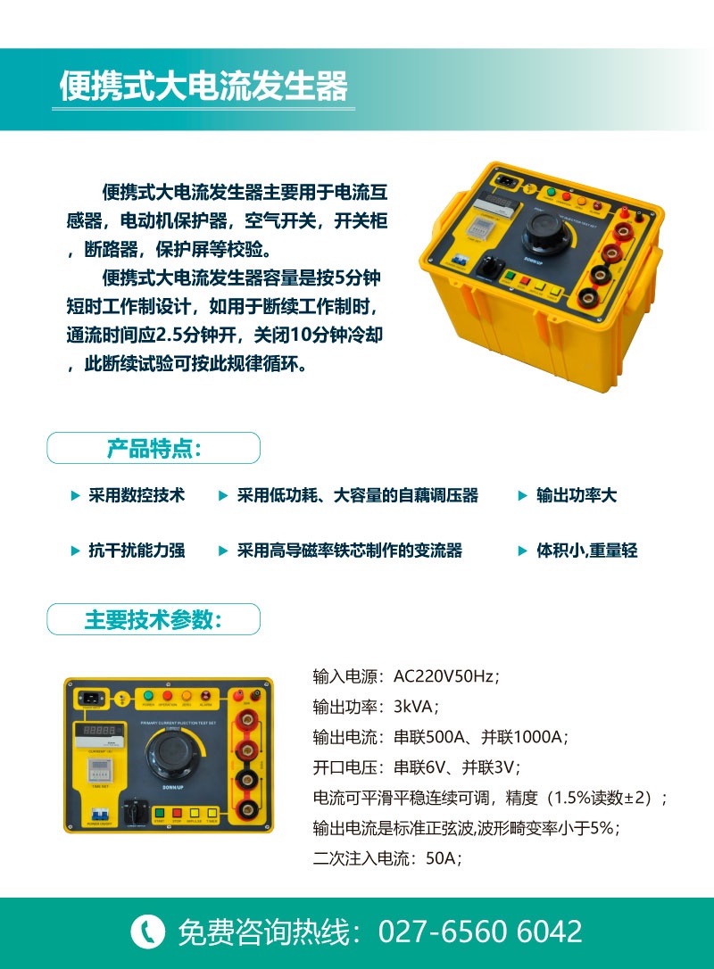 CYSL-BX-200便攜式大電流發生器是通過多年實踐經驗自行研制開發的測試設備,它集國內外同類產品的優點于一身,采用數控技術,抗干擾能力強,和上一代升流器相比,由于采用低功耗、大容量的自藕調壓器和高導磁率鐵芯制作的變流器,具有輸出功率大,體積小,重量輕等優點。主要用于電流互感器,電動機保護器,空氣開關,開關柜,斷路器,保護屏等校驗。